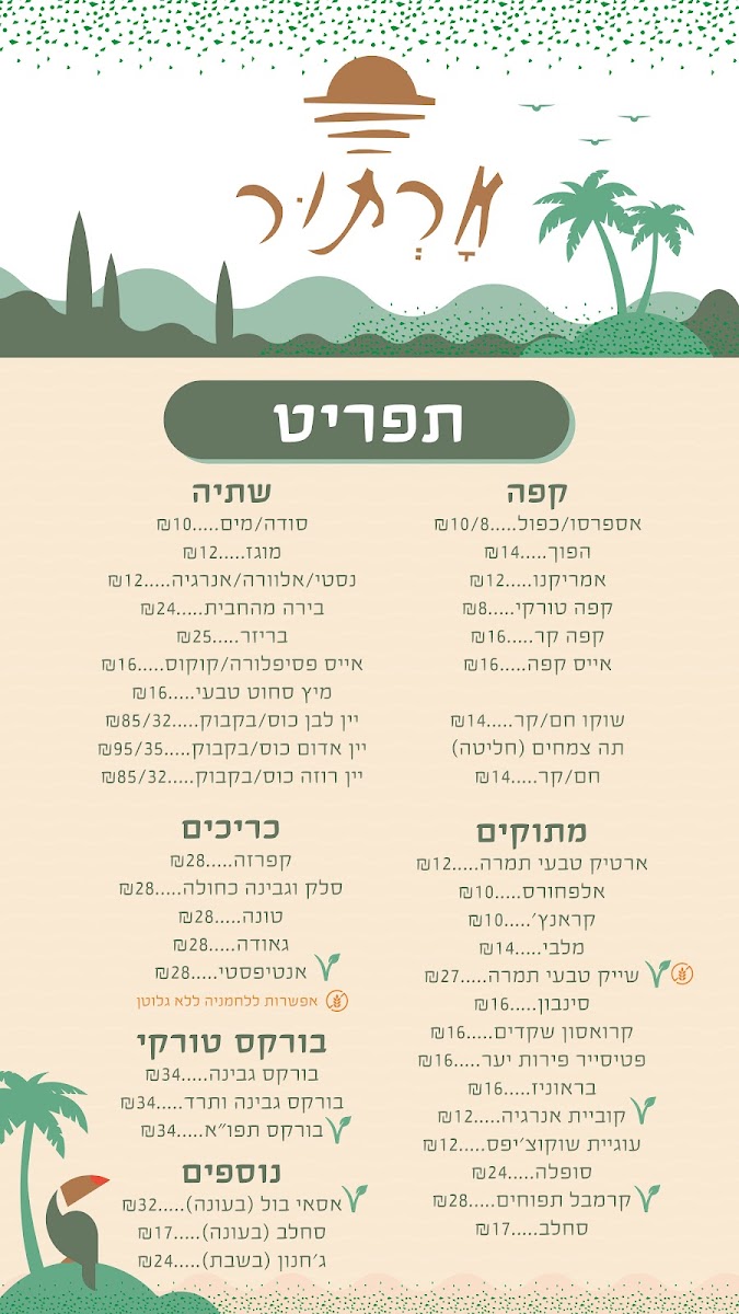 התפריט נותן תחושה ביתית וקלילה, בדיוק כמו האווירה שמאפיינת את המקום — שקטה, פתוחה, ועם שפע של אפשרויות להתיישב בנוחות וליהנות מהטבע ומהשקט.